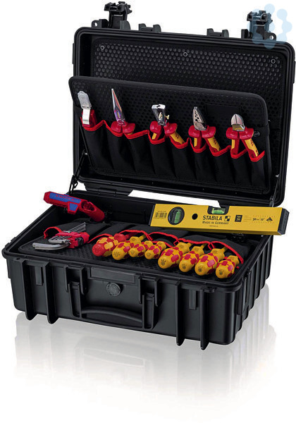 Flugtauglicher Koffer aus schlagfestem Polypropylen: staub-, luft-, und wasserdicht. automatisches Druckausgleichventil. temperaturstabil von -30°C bis +80°C. Vorrichtung für Vorhängeschloss. Werkzeugtafeln mit bestückbaren Werkzeugtaschen und diversen Werkzeugschlaufen. Bodenschale mit Aluminiumtrennsteg. bestückt mit: Knipex: VDE Flachrundzange 200 mm, VDE Seitenschneider 160 mm, VDE Abisolierzange 160 mm, VDE Crimpzange für Aderendhülsen 0,25 - 16 mm², Universal-Abmantelungswerkzeug ErgoStrip®, Kabelmesser mit Hakenklinge. Wera: 8 VDE Schraubendreher (2,5/3,5/5,5/6,5/PH1/PH2/PZ1/PZ2). Innensechskant-Schlüsselsatz (1,5 -10 mm). Stabila: Wasserwaage Typ 70 (30 cm). max. Zuladung: 25 kg