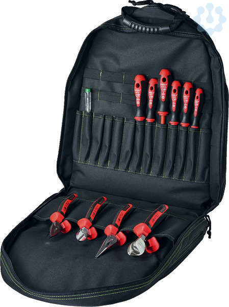 BackpackPro ?Basic 1000 V?Werkzeugrucksack für den professionellen Anwender, 3 Fächer aufklappbar bis zum Boden, vorne variabel ohne Einteilung, Mitte mit Einteilung für Werkzeuge, hinten mit Einsteckfächern und Laschen für Werkzeug oder Notebook + Zubehör, gepolsterte Schulterriemen, Beckengurt, abnehmbares Polster für Arbeiten im Sitzen oder Knien, bestückt mit 11 Werkzeugen, wasser- und schmutzabweisend,Material: extrem starkes 1680D-Polyester, Farbe: schwarz mitgrünen Nähten, BackpackPro 220265. Inhalt: 101999 Schraubendreher-Set 1000 V, Phillips, 6-teilig, je 1 Elektriker-Schraubendreher 1000 V2,5 x 75 mm, 4 x 100 mm, 5,5 x 125 mm, 6,5 x 150 mm, je 1 Kreuzschlitz-Schraubendreher 1000 V, PH Gr. 1 + 2 211200 Kombizange 1000 V, 180 mm 211204 Seitenschneider 1000 V, 160 mm 211208 Storchschnabelzange 1000 V, gerade, 200 mm 211223 Kabelschneider 1000 V, 200 mm 100647 Spannungsprüfer 100 ? 250 V, lose