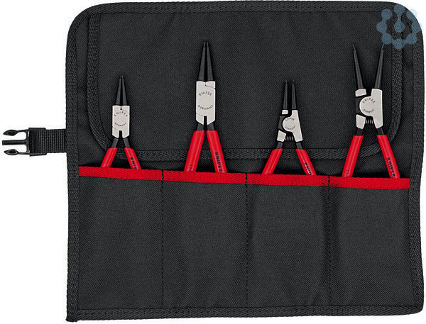 00 19 56 V01 Sicherungsringzangen-Set Rolltasche aus strapazierfähigem Polyester-Gewebe. Mit praktischem, verstellbarem Schnellverschluss. vier gängige Sicherungsringzangen für Innen- und Außenringe. Abmessungen, geöffnet (L x H): 315 x 275 mm. SB-Karte/Blister. Lieferumfang: 1 x 44 11 J1 KNIPEX Sicherungsringzange für Innenringe in Bohrungen (Ø 12 - 25 mm), 1 x 44 11 J2 KNIPEX Sicherungsringzange für Innenringe in Bohrungen (Ø 19 - 60 mm), 1 x 46 11 A1 KNIPEX Sicherungsringzange für Außenringe auf Wellen, 1 x 46 11 A2 KNIPEX Sicherungsringzange für Außenringe auf Wellen,
