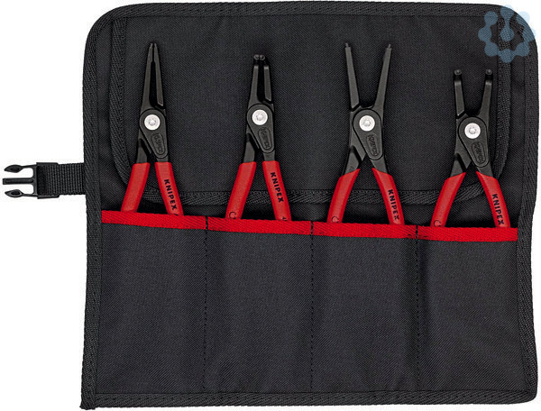 00 19 57 V01 Sicherungsringzangen-Set Rolltasche aus strapazierfähigem Polyester-Gewebe. Mit praktischem, verstellbarem Schnellverschluss. vier gängige Präzisions-Sicherungsringzangen für höchste Anforderungen. Abmessungen, geöffnet (L x H): 315 x 275 mm. SB-Karte/Blister. Lieferumfang: 1 x 48 11 J2 KNIPEX Präzisions-Sicherungsringzange für Innenringe in Bohrungen (Ø 19 - 60 mm), 1 x 48 21 J21 KNIPEX Präzisions-Sicherungsringzange für Innenringe in Bohrungen (Ø 19 - 60 mm), 1 x 49 11 A2 KNIPEX Präzisions-Sicherungsringzange für Außenringe auf Wellen, 1 x 49 21 A21 KNIPEX Präzisions-Sicherungsringzange für Außenringe auf Wellen,