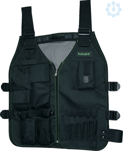 Werkzeugweste HAUPAWerkzeugweste für den Installateur. Schnelle Montage durch robusten Reißverschluss, mit Einsteckfächern innen und außen, besonders geeignet für den Einsatz bei warmen Temperaturen. Rutschfeste Schultergurte, Netzeinlage, atmungsaktiv, 2 Rücken-Dokumententaschen, 5 Schraubendrehertaschen (Gummibandjustierung), 1 Schreibstifttasche, 1 Handytasche (Klettverschluss), 1 Scherentasche (Gummibandjustierung), 2 Zangentaschen (Druckknopfverschluss), 1 Spannungsprüfertasche (Klettverschluss), 1 Tasche für Kleinteile (Klettverschluss), Hammerschlaufe. Universalgröße - individuell einstellbar. Farbe: schwarz, mit grünen Nähten