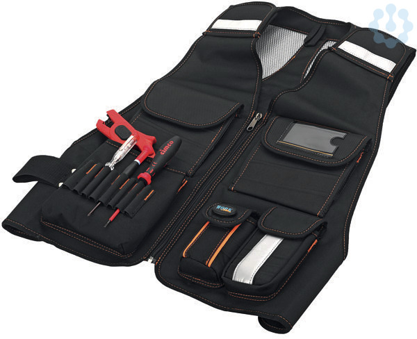 Werkzeug griffbereit am Mann und doch beide Hände frei! Zahlreiche praktische Ausstattungsdetails für den Profi-Einsatz gepolsterte Handytasche für Mobiltelefone, Brillen usw., mit Fixierband mit Klettverschluss und Elastikhalter für Schreibgerät, 2 Brusttaschen mit Klettverschluss, 1 davon ganz aufklappbar mit 4 innenliegenden Einsteckfächern, 2 große gepolsterte Hüfttaschen für diverse Werkzeuge, 1 davon mit Klettverschluss-Klappe, 8 kleine Elastikhalter für Schreibutensilien, Bohrer, Schraubendreher u. ä., Reißverschluss-Brusttasche für Visitenkarten, Tasche mit Sichtfenster, z. B. für Namensschild, mit Nieten verstärkte breite Halterung für Hammer, Zange u. ä., große Hintertasche mit 2 Reißverschlüssen für Kleinmaterial und Dokumente, von links und rechts zugänglich, komfortabel gepolsterte Schulterriemen, Weste in Einheitsgröße, individuell stufenlos weitenverstellbar. 480 x 660 mm, Gewicht nur 750 g