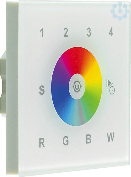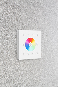 WIFI-Wandpanel fuer die Ansteuerung des WIFI-RGB-Controller. Steuerung von bis zu 4 separaten Zonen (Controllern). Fuer Schalterdosenmontage geeignet. Funktionen: Farbwechsel ueber Touch-Farbrad, Direktfarbwahl (rot, gruen, blau und weiß), Ein- und ausschalten, so wie Programmwechsel.