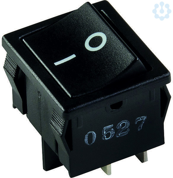 Wippenschalter Serie 3628 Wippenschalter, 10 (4) A, 2-polig, Ausschalter, Einbaumaß 22 x 19 mm, T 105°, Markierung 0-I, Flachsteckanschlüsse 4,8 x 0,8 mm, Gehäuse schwarz, Wippe schwarz Schalter unbeleuchtet