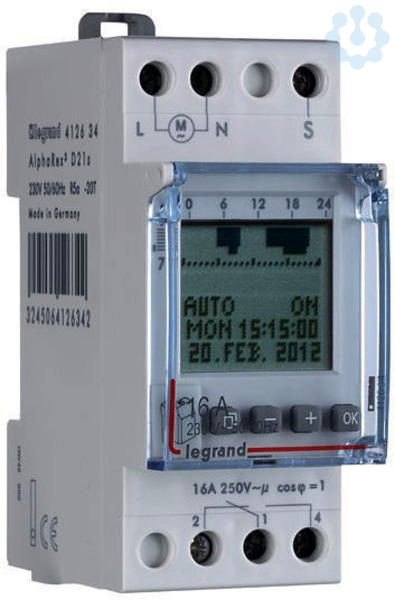Legrand AlphaRex³ D21, digitale Wochenzeitschaltuhr, 1 Kanal, 56 Schaltprogramme, Betriebsspannung 230 V 50/60 Hz, mit Steuereingang, Programmerstellung direkt am Gerät oder mit PC, AlphaSoft, PC-Adapter(412873) und Datenschlüssel(412872). Dauer EIN/AUS, Ferienprogramm, Zufallsprogramm, 1 Std.-Test, PIN-Code Sperre, Betriebsstundenzähler,Hintergrundbeleuchtung, automatische Sommer-/Winterzeitumstellung, 5 Jahre Gangreserve, Ganggenauigkeit +/- 0,1 Sek/Tag, Kürzeste Schaltzeit: 1 Sek., Nulldurchgangsschaltung. Schaltausgang: 1 Wechsler.