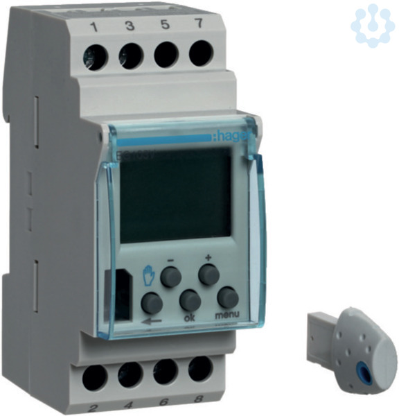 Wochenschaltuhr, 1 Wechslerkontakt, 16A, 2 PLE, 12/24V, digital. Wochenschaltuhr digital 1-Kanal zur zeitabhängigen Steuerung von Betriebsmitteln. Mit Programmierschlüssel zur einfachen Realisierung von Ausnahmeprogrammen. Mit Zufallssteuerung und Impulsausgabe. Temporäre und permanente Ausnahmesteuerung am Gerät, Balkenanzeige zur schnellen Erkennung der Tagesprogrammierung. Automatische Sommer-/Winterzeitumstellung.