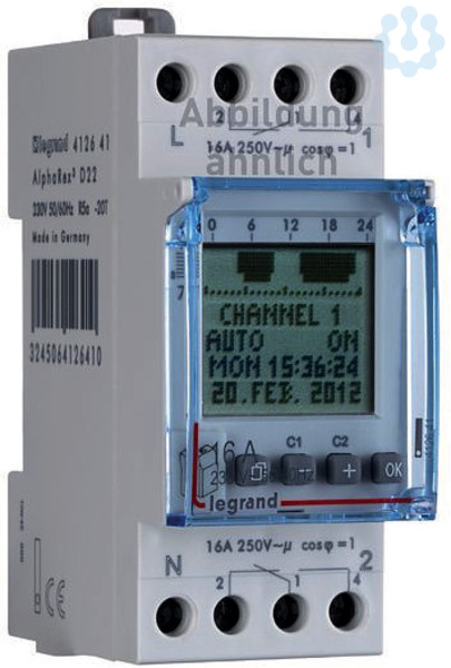 Legrand AlphaRex³ D22, digitale Wochenzeitschaltuhr, 2 Kanal, 56 Schaltprogramme (28 pro Kanal), Betriebsspannung 24 V 50/60 Hz und DC, Programmerstellung direkt am Gerät oder mit PC, AlphaSoft, PC-Adapter(412873) und Datenschlüssel(412872). Dauer EIN/AUS, Ferienprogramm, Zufallsprogramm, 1 Std.-Test, PIN-Code Sperre, Betriebsstundenzähler,Hintergrundbeleuchtung, automatische Sommer-/Winterzeitumstellung, 5 Jahre Gangreserve, Ganggenauigkeit +/- 0,1 Sek/Tag, Kürzeste Schaltzeit: 1 Sek., Nulldurchgangsschaltung. Schaltausgang: 2 Wechsler.