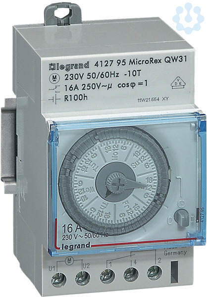 Legrand MicroRex QW31, analoge Wochenzeitschaltuhr mit Quarzmotor (Ganggenauigkeit +/- 2,5 Sek/Tag, Gangreserve 100 Std.), für Verteilereinbau, 1 Kanal, Betriebsspannung 230 V 50/60 Hz, mit Handschalter: EIN-Automatik-AUS, mit unverlierbaren Schaltsegmenten, Zeiger vorwärts und rückwärts drehbar, dadurch sehr leichte Einstellung von z.B. Sommer- und Winterzeit, Deckel plombierbar, kürzeste Schaltzeit: 4 Std.. Schaltausgang: 1 Wechsler.