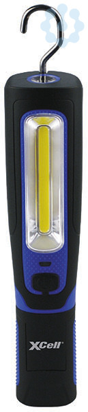 Tragbare und flexible LED-Arbeitsleuchte mit 3 WCOB-LED, 1 W LED am oberen Ende der Leuchte, 360° drehbar und 180° neigbar, Magneten an der Rück- und Unterseite, feste eingebauter Li-Ion 18650 Akku 3,6 V 2200 mAh, Gehäusefarbe: Schwarz/Blau, Lichtstrom: 280 lm, Länge: 243 mm, Breite: 52 mm, Höhe: 43 mm, Schutzart: IP64.