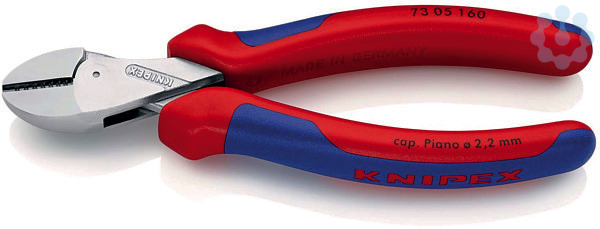 73 05 160 KNIPEX X-Cut® schneidet präzise feinste Drähte ebenso wie mehrdrähtige Kabel und harten Pianodraht. Kraftvoll, leicht und universell. Hohe Schneidleistung bei geringem Kraftaufwand durch optimale Abstimmung von Schneidenwinkel und Übersetzungsverhältnis. Durchgestecktes Gelenk: höchste Stabilität bei niedrigem Gewicht. Doppelt gelagerte Gelenkachse für harte, dauerhafte Beanspruchung. Große Öffnungsweite für dickere Kabel. Präziser Schnitt auch bei feinen Cu-Drähten. Kompakte, gewichtssparende Bauweise. Universell einsetzbar, in Montage, Instandhaltung und Produktion. 40 % Kraftersparnis im Vergleich zu Standard-Seitenschneidern gleicher Länge. - Schneidwerte weicher Draht (Durchmesser): Ø 4,8mm - Schneidwerte mittelharter Draht (Durchmesser): Ø 3,8mm - Schneidwerte harter Draht (Durchmesser): Ø 2,7mm - Schneidwerte Pianodraht (Durchmesser): Ø 2,2mm - Schneidwert Cu-Kabel, mehrdrähtig: Ø 12,0mm