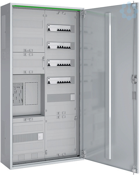 Komplettschrank bestehend aus: 1x eHZ-Kassette verdrahtet mit 5-poliger Hauptleitungsabzweigklemme, Sammelschienensystem 5-polig, 5x Anschlussklemmen 16 mm², 1x Zählerreserveplatz, 1x Verteilerfeld 5-reihig mit APZ-Raum inkl. RJ45-Schnittstelle, ohne Verdrahtung, 1x Bestückungspaket für die Umsetzung der DIN 18015-1 bestehend aus: 1x Überspannungsschutz T1+T2+T3 7,5 kA TT/TNS und 24x LS B16 A, 4x RCD 30 mA, 1x Klingeltrafo 1 A/8(12) V Fabrikat: Schneider Electric