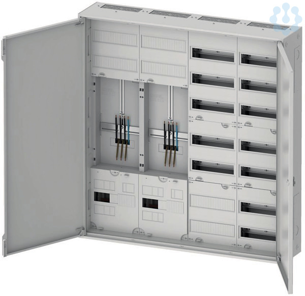 Zählerkomplettschrank nach VDE AR-N 4101:2015-09 Zwei Zählerfelder mit 3-Punkt-Zählerkreuz bestückt, 10mm² Unterer Anschlussraum mit 5 pol. Sammelschienensystem 12x5mm, incl. Anschlussklemmen 16mm² zur Aufnahme selektiver Hauptleitungsschutzschalter bis 63 A RJ45-Anschlussbuchse isoliert, lose beigepackt Oberer Anschlussraum mit Hauptleitungsklemme 5x25mm², fingersicher Verteilerfeld mit 5 x 12 TE mit 2x PEN-Schiene in Stecktechnik und APZ-Platz Verteilerfeld mit 7 x 12 TE mit 2x PEN-Schiene in Stecktechnik APZ: Ja, eingebaut im Verteilerfeld unten, incl. Schutzschlauch für Datenleitung Schutzart: IP31 Maße mm: Höhe 1100, Breite 1050, Tiefe 225