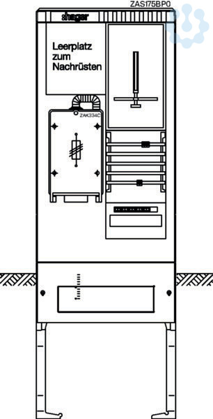 Zähleranschlusssäule 175,universN,1 Zählerplatz,3-Punkt,4-polig,Leerplatz,HAK. Bestückte Zähleranschlusssäule nach DIN EN 61439, Schutzart IP 44, mit Eingrabsockel, aus glasfaserverstärktes Polyester FS 833.5 nach DIN EN 14598. Zähleranschlusssäule ist nach den aktuellen technischen Anschlussbedingungen des jeweiligen Energieversorgers bestückt und deckt die jeweiligen TAB-Anforderungen ab. Profiliertes Gehäuse im Rippendesign. Tür mit Öffnungswinkel 180 Grad bei freiem Stand und 90 Grad bei angereihten Gehäusen. Rechte Tür ist aushängbar. Schließung mit Schwenkhebel und Drei-Punkt-Basküleverschluss mit 1 bzw. 2 Profilhalbzylindern. Eingebauter Zylinder unten mit gleichschließender Serie. Ein zweiter Schließzylinder (z. B. aus VNB-Schließanlage) kann oben nach Entfernen des Vierkantverschlusses eingebaut werden. Wenn kein zweiter Profilhalbzylinder eingebaut wird, muss die zweite obere Öffnung mit einem Blindverschluss bestückt werden. Die Belüftung erfolgt über labyrinthartig ausgebildete Lüftungskanäle und