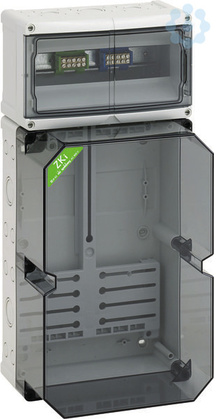 Zählergehäuse, Industrie Qualität, mit transparentem Deckel, serienmäßig plombierbar, mit montiertem Zählerkreuz und Zählerbefestigungsschrauben, serienmäßig plombierbarer Konsumentenraum oben, mit 35mm Normschiene und PE/N-Doppelklemmen, mit Doppelmembranstutzen, Verschluss- und Isolierstopfen, für Drehstromzähler