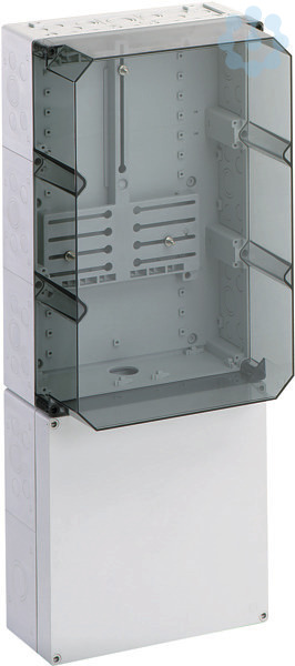 Zählergehäuse, Industrie Qualität, Geräte-Einbaufläche Zählerfeld nach DIN 43870-1, mit transparentem Deckel, serienmäßig plombierbar, mit montiertem Zählerkreuz für Drehstromzähler und Zählerbefestigungsschrauben, separater, zusätzlicher Anschlussraum unten 300mm, mit 35mm Normschiene, mit Doppelmembranstutzen, Verschluss- und Isolierstopfen
