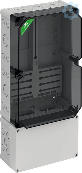 Zählergehäuse, Industrie Qualität, mit transparentem Deckel, serienmäßig plombierbar, mit montiertem Zählerkreuz und Zählerbefestigungsschrauben, zusätzlicher Anschlussraum unten 150mm mit 35mm Normschiene, mit Doppelmembranstutzen, Verschluss- und Isolierstopfen, geeignet für Rundsteuerempfänger nach DIN 43861-2, für Zähler mit Drei-Punkt-Befestigung und einer Tiefe von max. 80mm