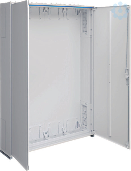 Zählerschrank, univers Z, 1400x1050x205 mm,Schutzklasse II, 432 Platzeinheiten. Schrankgehäuse nach DIN VDE 0603-1, Maßnorm DIN 43870 zur Aufputz, Unterputz oder teilversenkter Montage. Zum Aufbau einer Zählerverteileranlage bis 355 A, Bemessungsspannung 230/400 V 50 Hz. Schutzart IP31 (IP44/IP54 nach DIN VDE 0470-1), Schutzklasse II schutzisoliert, Schutzart IP3X hinter der Tür. Bestehend aus Schrank mit Tür aus pulverbeschichtetem, eingebranntem, stabil profiliertem 1 mm dickem Stahlblech. Innenauskleidung komplett aus Kunststoff. Leitungseinführungen oben und unten durch eingebaute Kunststoffflanschplatten, rückseitige Vorprägung im Kunststoffteil und seitlich eingebaute Kunststoff-Flanschplatten im Bereich des NAR (geeignet als Sammelschienendurchführung), des RfZ (nur bei Bauhöhe 1100 mm) und des AAR. Tür frontbündig mit innenliegenden, justierbaren Scharnieren, wahlweise rechts oder links anschlagbar mit 110° Öffnungswinkel. Türverschluss mit Vorreiber, ab Breite 800 mm und bei allen Schränken ab einer