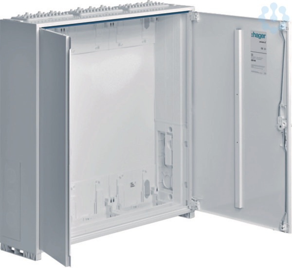 Zählerschrank, univers Z, 800x800x205 mm,Schutzklasse II, 180 Platzeinheiten. Schrankgehäuse nach DIN VDE 0603-1, Maßnorm DIN 43870 zur Aufputz, Unterputz oder teilversenkter Montage. Zum Aufbau einer Zählerverteileranlage bis 355 A, Bemessungsspannung 230/400 V 50 Hz. Schutzart IP31 (IP44/IP54 nach DIN VDE 0470-1), Schutzklasse II schutzisoliert, Schutzart IP3X hinter der Tür. Bestehend aus Schrank mit Tür aus pulverbeschichtetem, eingebranntem, stabil profiliertem 1 mm dickem Stahlblech. Innenauskleidung komplett aus Kunststoff. Leitungseinführungen oben und unten durch eingebaute Kunststoffflanschplatten, rückseitige Vorprägung im Kunststoffteil und seitlich eingebaute Kunststoff-Flanschplatten im Bereich des NAR (geeignet als Sammelschienendurchführung), des RfZ (nur bei Bauhöhe 1100 mm) und des AAR. Tür frontbündig mit innenliegenden, justierbaren Scharnieren, wahlweise rechts oder links anschlagbar mit 110° Öffnungswinkel. Türverschluss mit Vorreiber, ab Breite 800 mm und bei allen Schränken ab einer Hö