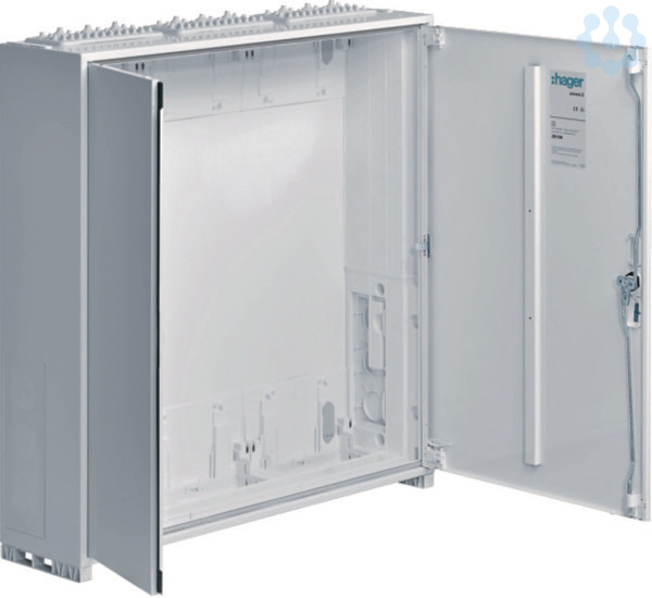 Zählerschrank, univers Z, 800x800x205 mm,Schutzklasse II, 180 Platzeinheiten. Schrankgehäuse nach DIN VDE 0603-1, Maßnorm DIN 43870 zur Aufputz, Unterputz oder teilversenkter Montage. Zum Aufbau einer Zählerverteileranlage bis 355 A, Bemessungsspannung 230/400 V 50 Hz. Schutzart IP31 (IP44/IP54 nach DIN VDE 0470-1), Schutzklasse II schutzisoliert, Schutzart IP3X hinter der Tür. Bestehend aus Schrank mit Tür aus pulverbeschichtetem, eingebranntem, stabil profiliertem 1 mm dickem Stahlblech. Innenauskleidung komplett aus Kunststoff. Leitungseinführungen oben und unten durch eingebaute Kunststoffflanschplatten, rückseitige Vorprägung im Kunststoffteil und seitlich eingebaute Kunststoff-Flanschplatten im Bereich des NAR (geeignet als Sammelschienendurchführung), des RfZ (nur bei Bauhöhe 1100 mm) und des AAR. Tür frontbündig mit innenliegenden, justierbaren Scharnieren, wahlweise rechts oder links anschlagbar mit 110° Öffnungswinkel. Türverschluss mit Vorreiber, ab Breite 800 mm und bei allen Schränken ab einer Hö