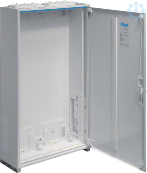 Zählerschrank, univers Z, 950x550x205 mm,Schutzklasse II, 144 Platzeinheiten. Schrankgehäuse nach DIN VDE 0603-1, Maßnorm DIN 43870 zur Aufputz, Unterputz oder teilversenkter Montage. Zum Aufbau einer Zählerverteileranlage bis 355 A, Bemessungsspannung 230/400 V 50 Hz. Schutzart IP31 (IP44/IP54 nach DIN VDE 0470-1), Schutzklasse II schutzisoliert, Schutzart IP3X hinter der Tür. Bestehend aus Schrank mit Tür aus pulverbeschichtetem, eingebranntem, stabil profiliertem 1 mm dickem Stahlblech. Innenauskleidung komplett aus Kunststoff. Leitungseinführungen oben und unten durch eingebaute Kunststoffflanschplatten, rückseitige Vorprägung im Kunststoffteil und seitlich eingebaute Kunststoff-Flanschplatten im Bereich des NAR (geeignet als Sammelschienendurchführung), des RfZ (nur bei Bauhöhe 1100 mm) und des AAR. Tür frontbündig mit innenliegenden, justierbaren Scharnieren, wahlweise rechts oder links anschlagbar mit 110° Öffnungswinkel. Türverschluss mit Vorreiber, ab Breite 800 mm und bei allen Schränken ab einer Hö