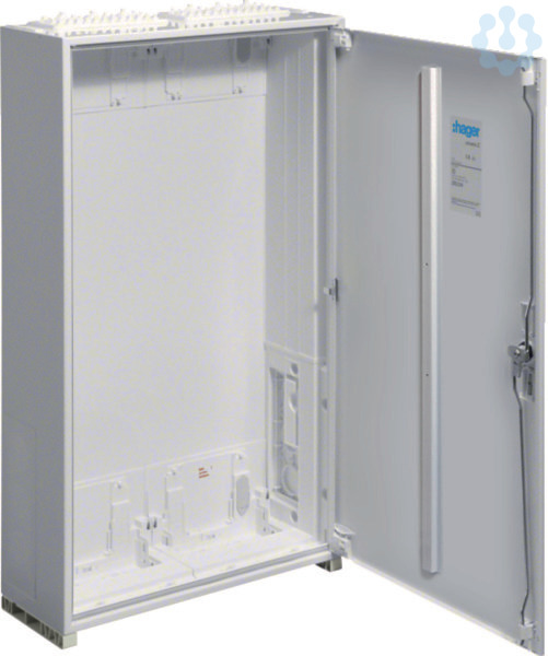 Zählerschrank, univers Z, 950x550x205 mm,Schutzklasse II, 144 Platzeinheiten. Schrankgehäuse nach DIN VDE 0603-1, Maßnorm DIN 43870 zur Aufputz, Unterputz oder teilversenkter Montage. Zum Aufbau einer Zählerverteileranlage bis 355 A, Bemessungsspannung 230/400 V 50 Hz. Schutzart IP31 (IP44/IP54 nach DIN VDE 0470-1), Schutzklasse II schutzisoliert, Schutzart IP3X hinter der Tür. Bestehend aus Schrank mit Tür aus pulverbeschichtetem, eingebranntem, stabil profiliertem 1 mm dickem Stahlblech. Innenauskleidung komplett aus Kunststoff. Leitungseinführungen oben und unten durch eingebaute Kunststoffflanschplatten, rückseitige Vorprägung im Kunststoffteil und seitlich eingebaute Kunststoff-Flanschplatten im Bereich des NAR (geeignet als Sammelschienendurchführung), des RfZ (nur bei Bauhöhe 1100 mm) und des AAR. Tür frontbündig mit innenliegenden, justierbaren Scharnieren, wahlweise rechts oder links anschlagbar mit 110° Öffnungswinkel. Türverschluss mit Vorreiber, ab Breite 800 mm und bei allen Schränken ab einer Hö
