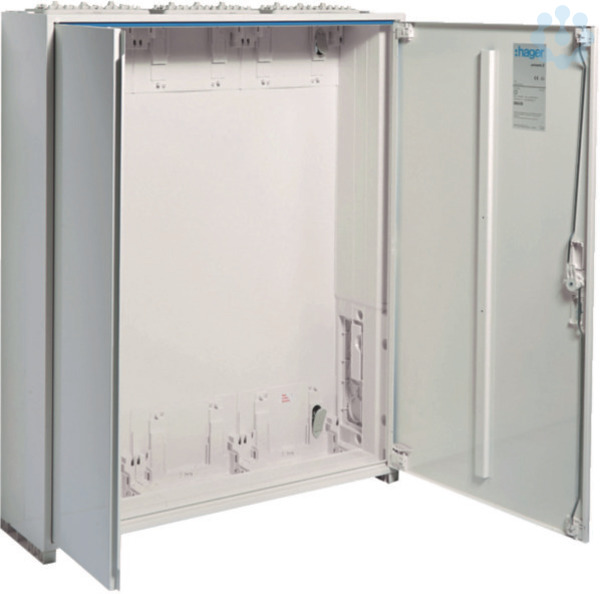 Zählerschrank, univers Z, 950x800x205 mm,Schutzklasse II, 216 Platzeinheiten. Schrankgehäuse nach DIN VDE 0603-1, Maßnorm DIN 43870 zur Aufputz, Unterputz oder teilversenkter Montage. Zum Aufbau einer Zählerverteileranlage bis 355 A, Bemessungsspannung 230/400 V 50 Hz. Schutzart IP31 (IP44/IP54 nach DIN VDE 0470-1), Schutzklasse II schutzisoliert, Schutzart IP3X hinter der Tür. Bestehend aus Schrank mit Tür aus pulverbeschichtetem, eingebranntem, stabil profiliertem 1 mm dickem Stahlblech. Innenauskleidung komplett aus Kunststoff. Leitungseinführungen oben und unten durch eingebaute Kunststoffflanschplatten, rückseitige Vorprägung im Kunststoffteil und seitlich eingebaute Kunststoff-Flanschplatten im Bereich des NAR (geeignet als Sammelschienendurchführung), des RfZ (nur bei Bauhöhe 1100 mm) und des AAR. Tür frontbündig mit innenliegenden, justierbaren Scharnieren, wahlweise rechts oder links anschlagbar mit 110° Öffnungswinkel. Türverschluss mit Vorreiber, ab Breite 800 mm und bei allen Schränken ab einer Hö