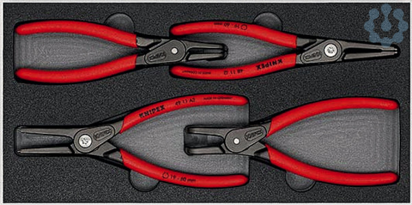 00 20 01 V09 Zangen-Set In Schaumstoffeinlage für Werkbank und Werkstattwagen. Zur übersichtlichen Aufbewahrung der Werkzeuge. Präzise Mulden für die Aufnahme der Zangen. Abmessungen der Schaumstoffeinlage (B x H x T): 335 x 33 x 165 mm. Werkstoff: zweifarbiger, geschlossenporiger Schaumstoff. vier Präzisions-Sicherungsringzangen in Schaumstoffeinlage. Lieferumfang: 1 x 48 11 J2 KNIPEX Präzisions-Sicherungsringzange für Innenringe in Bohrungen (Ø 19 - 60 mm), 1 x 48 21 J21 KNIPEX Präzisions-Sicherungsringzange für Innenringe in Bohrungen (Ø 19 - 60 mm), 1 x 49 11 A2 KNIPEX Präzisions-Sicherungsringzange für Außenringe auf Wellen, 1 x 49 21 A21 KNIPEX Präzisions-Sicherungsringzange für Außenringe auf Wellen,
