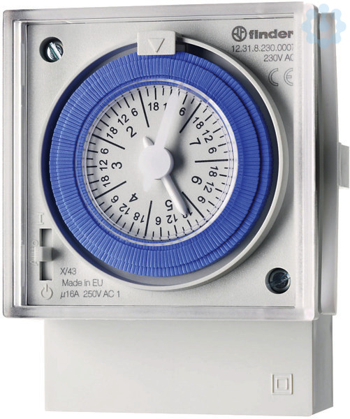 Schaltuhr für Fronttafeleinbau, 72 x 72 mm, 1 Wechsler für 16 A / 250 V AC (AC1), Kontaktmaterial AgCdO, max. Schaltleistungen bei 230 V AC: AC1-4.000 VA, AC15-420 VA, Lampenlasten: Glüh- und Halogenlampen 2000 W, Leuchtstofflampen kompensiert 750 W, Leuchtstofflampen unkompensiert 1000 W, Halogenlampen (230 V AC) 2000 W, Motorantrieb-quarzgesteuert, Wochenprogramm mit 100 h Gangreserve Anschlussspannung: 230 V AC (50/60 Hz)