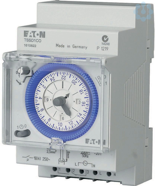 Reiheneinbau-Schaltuhr ohne Gangreserve, Breite 52,5mm, 24 Std. Programm, kürzeste Schaltzeit 15 Min., Uhrzeiger für Zeitanzeige und 12h/24h Erkennung, Uhrzeitkorrektur im und gegen den Uhrzeigersinn möglich, Schaltungsvorwahl, Handschalter mit 3 Stellungen: Dauer- EIN/AUTO/Dauer- AUS, Schaltzustandsanzeige, DuoFix Federsteckklemmen für jeweils 2 Leiter, 1 Wechsler 16 A/250 V~, 230V / 50 Hz, Klarsichtabdeckung plombierbar.