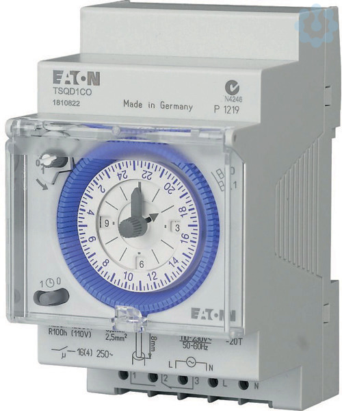 Reiheneinbau-Schaltuhr mit ca. 200 Stunden Gangreserve, Breite 52,5 mm, 24 Std. Programm, kürzeste Schaltzeit 15 Min., Uhrzeiger für Zeitanzeige und 12h/24h Erkennung, Uhrzeitkorrektur im und gegen den Uhrzeigersinn möglich, Schaltungsvorwahl, Handschalter mit 3 Stellungen: Dauer- EIN/AUTO/Dauer- AUS, Schaltzustandsanzeige, DuoFix Federsteckklemmen für jeweils 2 Leiter, 1 Wechsler 16A/250V~, 230V /45-50 Hz, Klarsichtabdeckung plombierbar.