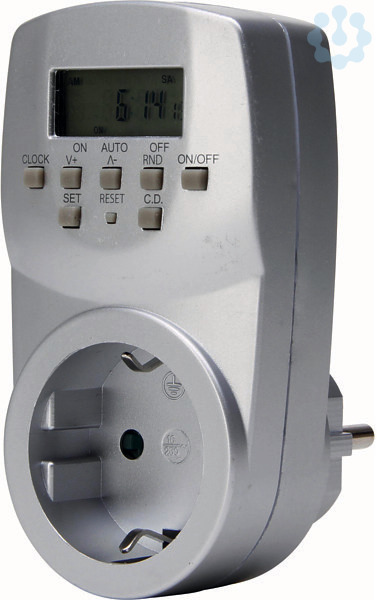 Mini Zeitschaltuhr digital, IP20, 230V~, 7,8A, max. 1.800 W, Farbe silber mit erhöhtem Berührungschutz, 12 oder 24 Stunden Display, mit Countdown und Zufallsfunktion, max. 140x Ein/Aus Progrramme pro Woche