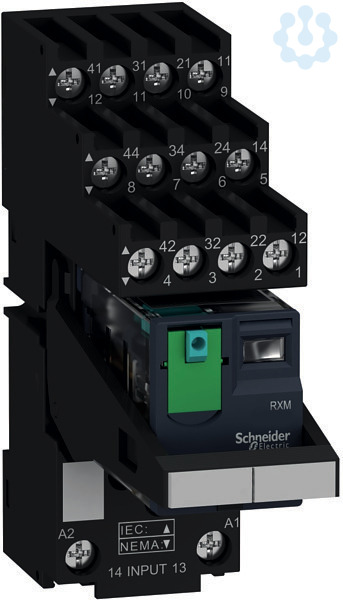 Zelio Relay. Vormontiertes und direkt einsetzbares Miniaturrelais RXM bestehend aus Relais, Sockel, Haltebügel und Beschriftungsschild. Anzahl Kontakte- 4, Ausführung- Relaiswechsler, Kontaktbelastbarkeit- je 6 A. Spulen-Steuerspannung- 24 VDC. Mechanische Stellungsanzeige- ja, LED-Anzeige- nein. Prüftaste zum Testen der Kontakte- ja, Prüfhebel zur dauerhaften Umschaltung für Testzwecke- ja, Bedienung- werkzeuglos. Stecksockel mit Schraubklemmen in kombinierter Anordnung zur Montage auf Hutschiene oder aufschraubbar auf Montageplatte. Kunststoffhaltebügel zur Fixierung und einfachen Entnahme des Relais. Beschriftungsschild zur Kennzeichnung. Alle Komponenten sind einsatzfertig montiert und das vormontierte Relais kann sofort eingesetzt werden.