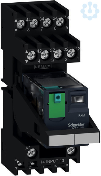 Zelio Relay. Vormontiertes und direkt einsetzbares Miniaturrelais RXM bestehend aus Relais, Sockel, Haltebügel und Beschriftungsschild. Anzahl Kontakte- 2, Ausführung- Relaiswechsler, Kontaktbelastbarkeit- je 12 A. Spulen-Steuerspannung- 24 VDC. Mechanische Stellungsanzeige- ja, LED-Anzeige- ja. Prüftaste zum Testen der Kontakte- ja, Prüfhebel zur dauerhaften Umschaltung für Testzwecke- ja, Bedienung- werkzeuglos. Stecksockel mit Schraubklemmen in kombinierter Anordnung zur Montage auf Hutschiene oder aufschraubbar auf Montageplatte. Kunststoffhaltebügel zur Fixierung und einfachen Entnahme des Relais. Beschriftungsschild zur Kennzeichnung. Alle Komponenten sind einsatzfertig montiert und das vormontierte Relais kann sofort eingesetzt werden.