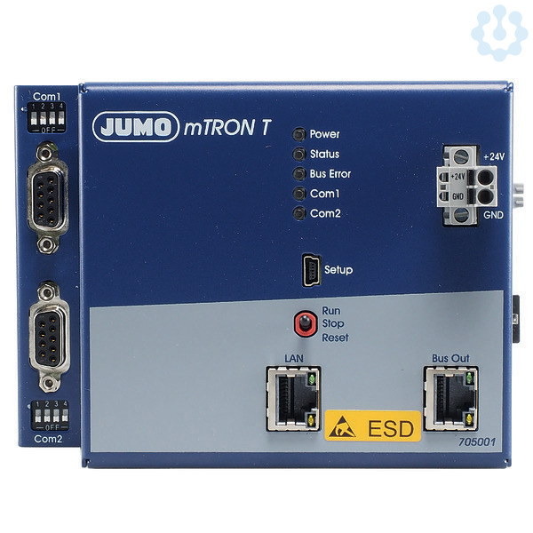 Die Zentraleinheit beinhaltet das Prozessabbild der Applikation und verwaltet die Konfigurations- und Parameterdaten des Gesamtsystems mTRON T (mit Ausnahme des Multifunktionspanels). Insgesamt können 64 Grenzwerte überwacht werden. Das Anliegen der Spannungsversorgung, Störungen des Systems sowie die Kommunikation über Schnittstellen werden durch Leuchtdioden signalisiert. Serienmäßig stehen eine USB-Device-Schnittstelle (Setup), ein LAN Anschluss (Ethernet) und zwei Systembusanschlüsse zur Verfügung. Es stehen zusätzlich eine Schnittstelle RS422/485, SPS nach IEC 61131-3 sowie ein Programmgeber zur Verfügung. Die Zentraleinheit, die seitlich angeschlossenen und die über Router angebundenen Ein-/Ausgangsmodule werden mit dem optionalen Setup-Programm komfortabel konfiguriert und parametriert. Die Spannungsversorgung beträgt DC 24 V +25/-20 %.
