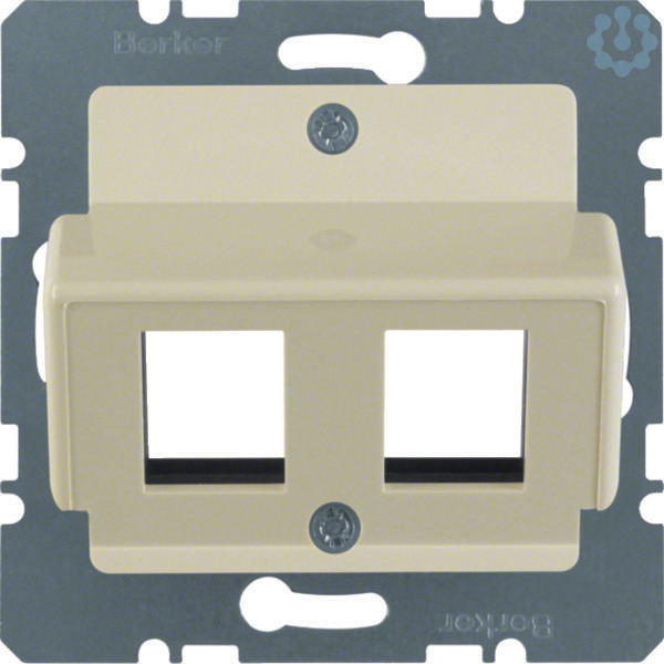 Zentralplatte für AMP Modular Jacks Zentralplattensystem weiß, glänzend. Zentralplatte 2-fach für AMP Modular Jacks Serie 110 Connect, Cat.3 / Cat.5 / Cat.5e und Cat.6 sowie AMP LWL-Kupplungen MT-RJ Jacks. Mit Tragplatte, mit 30° Schrägauslass, ohne Spreizkrallen. Hinweis: Nur mit Zwischenring des Schalterprogramms zu verwenden. Beschriftungsfeld einrastbar in passenden Zwischenring.