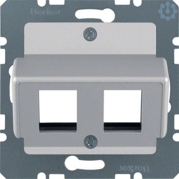 Zentralplatte für AMP Modular Jacks Zentralplattensystem alu, matt. Zentralplatte 2-fach für AMP Modular Jacks Serie 110 Connect, Cat.3 / Cat.5 / Cat.5e und Cat.6 sowie AMP LWL-Kupplungen MT-RJ Jacks. Mit Tragplatte, mit 30° Schrägauslass, ohne Spreizkrallen. Hinweis: Nur mit Zwischenring des Schalterprogramms zu verwenden. Beschriftungsfeld einrastbar in passenden Zwischenring.