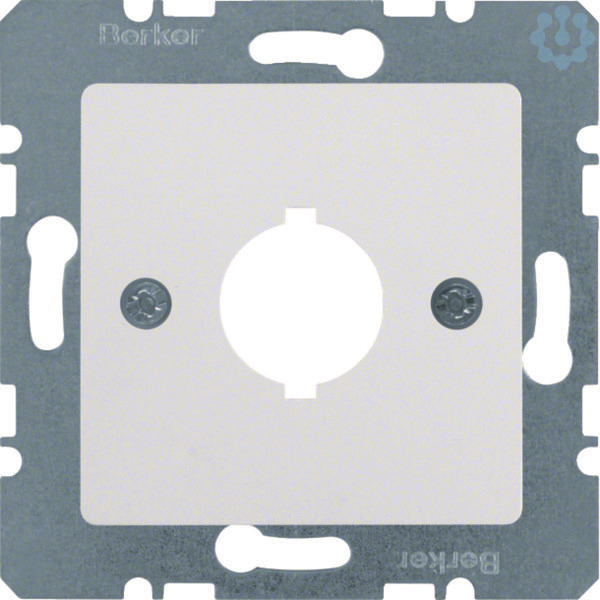 Zentralplatte für Melde- und Befehlsgerät Ø 18,8 mm polarweiß, glänzend. Zentralplatte für Melde- und Befehlsgerät mit Tragplatte, mit Ausschnitt, nur für Schraubbefestigung über Tragplatte. Geeignet für Potentialausgleich-Einbaubuchse, Rundsteckverbinder und Kleinspannungsbuchse. Hinweis: Nur mit Zwischenring des Schalterprogramms zu verwenden. Beschriftungsfeld einrastbar in passenden Zwischenring.
