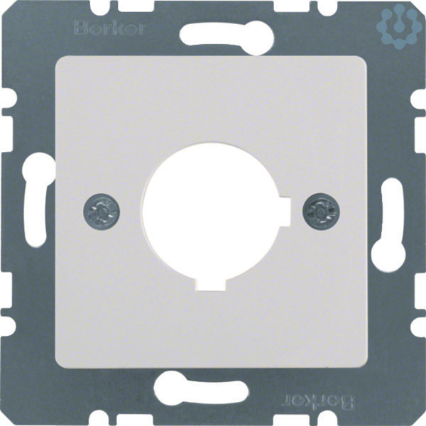 Zentralplatte für Melde- und Befehlsgerät Ø 22,5 mm polarweiß, glänzend. Zentralplatte für Melde- und Befehlsgerät mit Tragplatte, mit Ausschnitt, nur für Schraubbefestigung über Tragplatte. Geeignet für Potentialausgleich-Einbaubuchse, Rundsteckverbinder und Kleinspannungsbuchse. Hinweis: Nur mit Zwischenring des Schalterprogramms zu verwenden. Beschriftungsfeld einrastbar in passenden Zwischenring.