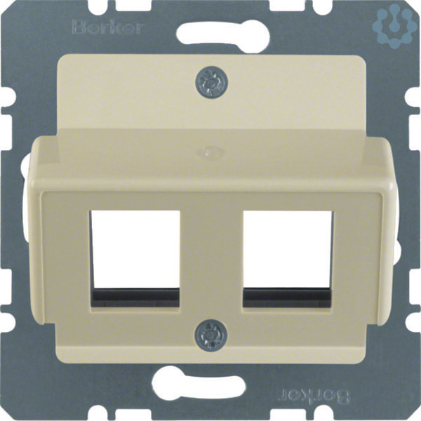Zentralplatte für Krone Modular Jacks Zentralplattensystem weiß, glänzend. Zentralplatte 2-fach für Krone Modular Jacks, Cat.5 / Cat.5e/ Cat.6, Krone LWL-Kupplungen MT-RJ Jacks und 3M LWL-Kupplungen Volition. Mit Tragplatte, 30° Schrägauslass, ohne Spreizkrallen. Hinweis: Nur mit Zwischenring des Schalterprogramms zu verwenden. Beschriftungsfeld einrastbar in passenden Zwischenring.