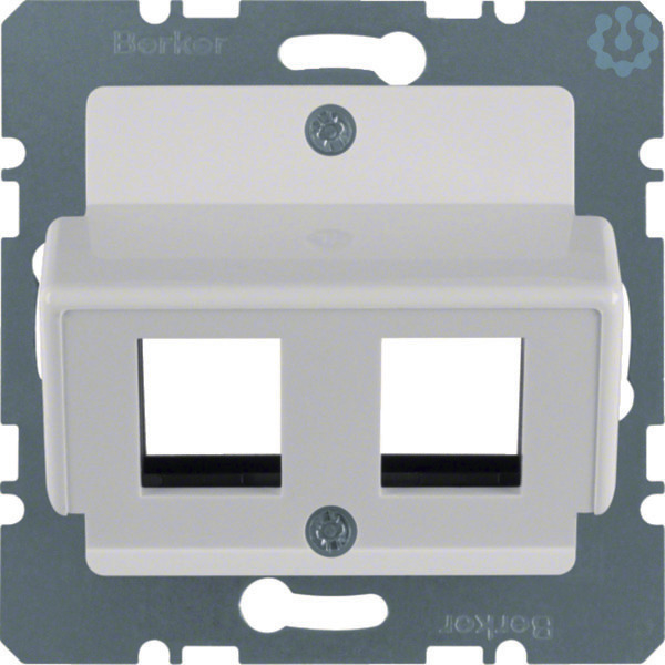 Zentralplatte 2f. f. Krone Modular Jacks Zentralplattensystem polarweiß, glänz. Zentralplatte 2-fach für Krone Modular Jacks, Cat.5 / Cat.5e/ Cat.6, Krone LWL-Kupplungen MT-RJ Jacks und 3M LWL-Kupplungen Volition. Mit Tragplatte, 30° Schrägauslass, ohne Spreizkrallen. Hinweis: Nur mit Zwischenring des Schalterprogramms zu verwenden. Beschriftungsfeld einrastbar in passenden Zwischenring.