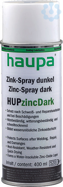 Zink-Spray HUPzincDark/LightAnwendung HUPzincDark/HUPzincLight: Zur Nachbesserung von feuerverzinkten Teilen, nachträglicher Schutz nach Schweißarbeiten, zur Ausbesserung beschädigter Oberflächen, Korrosionsschutz durch galvanische Wirkung, Schutzversiegelung für Rohrleitungen und Metalle, Grundierung für nachfolgende Anstriche. Bildet eine dauerhafte Schutzschicht mit wasserunlöslichem Zinkoxid auf Eisen (Stahl) und schützt damit auch schadhafte Stellen. Eigenschaften: HUPzinc ist ein Gemisch aus hochreinem Zink- und Aluminiumpulver, hitzebeständig, witterungsbeständig und schnelltrocknend.? Schutz nach Schweiß- und Reparaturarbeiten und bei Beschädigungen ? Hitzebeständig, witterungsbeständig und schnelltrocknend ? Bildet wasserunlösliche Zinkoxidschicht
