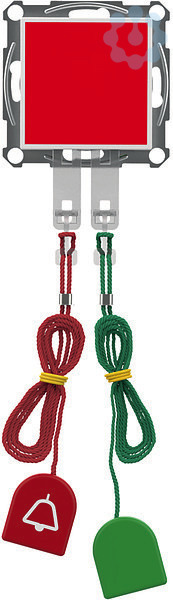 Zugtaster-/Zugabstelltaster mit Zentralplatte Schnur 3m/1m SIGMA care System M. Der Zugruf- und Abstelltaster dient zum Auslösen eines Rufes, sowie zum Abstellen eines Rufes durch das Personal. Eine optische und akustische Signalisierung wird an einem sichtbar montierten Zimmermodul außerhalb des Raumes angezeigt. Rote Zugschnur in 3 m Länge und rotes Griffstück mit Rufsymbol, Rundum rot leuchtende Gehäuseseiten, die Rufauslösung anzeigen. Grüne Zugschnur in 1 m Länge und grünes Griffstück zur Abstellung des Rufes, Eine Arretierungsnase auf der. Geräterückseite, hält das Gerät bei starkem Zug im Rahmen. Die Montage erfolgt senkrecht auf einer 60er UP-Dose, z. B. in einem behindertengerechten WC. Betriebsspannung: DC 24 V ± 10 %, über das Zimmermodul ELG745010. Stromaufnahme: max. 45 mA, Anschlussklemme: Steckklemme, 4-polig, 2 Leiter je Pol, Leitungstyp: J-Y(St)Y, 2 x 2 x 0,8 mm, Schutzart: IP20, Leitungslänge: max. 50 m, Abmessungen (B x H x T): 55 x 55 x 20 mm.