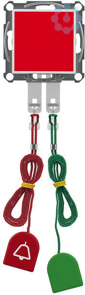 Zugtaster-/Zugabstelltaster mit Zentralplatte Schnur 3m/1m SIGMA care ELSO Joy. Der Zugruf- und Abstelltaster dient zum Auslösen eines Rufes, sowie zum Abstellen eines Rufes durch das Personal. Eine optische und akustische Signalisierung wird an einem sichtbar montierten Zimmermodul außerhalb des Raumes angezeigt. Rote Zugschnur in 3 m Länge und rotes Griffstück mit Rufsymbol, Rundum rot leuchtende Gehäuseseiten, die Rufauslösung anzeigen. Grüne Zugschnur in 1 m Länge und grünes Griffstück zur Abstellung des Rufes, Eine Arretierungsnase auf der. Geräterückseite, hält das Gerät bei starkem Zug im Rahmen. Die Montage erfolgt senkrecht auf einer 60er UP-Dose, z. B. in einem behindertengerechten WC. Betriebsspannung: DC 24 V ± 10 %, über das Zimmermodul ELG745010. Stromaufnahme: max. 45 mA, Anschlussklemme: Steckklemme, 4-polig, 2 Leiter je Pol, Leitungstyp: J-Y(St)Y, 2 x 2 x 0,8 mm, Schutzart: IP20, Leitungslänge: max. 50 m, Abmessungen (B x H x T): 55 x 55 x 20 mm. Bei Verwendung in den Designs ELSO Fashion/Riv