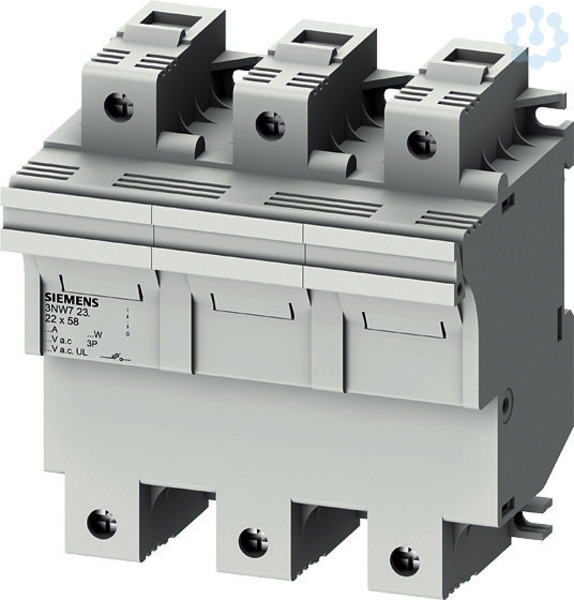 SENTRON, Zylindersicherungshalter, 22x58 mm, 3-polig, In: 100 A, Un AC: 690 V SENTRON Zylindersicherungssystem für den selektiven Anlagenschutz. Siemens Zylindersicherungseinsätze und -sicherungshalter sind für den Einsatz in industriellen Anlagen geeignet. Sie sind in Europa Standard und als Sicherungstrennschalter geprüft und zugelassen aber nicht zum Schalten unter Last vorgesehen. Für das Schalten unter Last bietet Siemens ein umfangreiches Portfolio z.B. 3KF an. Die Siemens Zylindersicherungssysteme zeichnen sich vor allem aus durch: 1. Erfüllung der Normen IEC 60269-1, -2 und -3. 2. Erfüllung der Norm UL 512. 3. Schnellen Sicherungswechsel durch Platz für Ersatzsicherungen im Einschub. 4. Schnelles Erkennen der ausgelösten Sicherung durch blinkende LED im Falle der Auslösung.