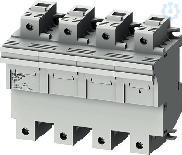 SENTRON, Zylindersicherungshalter, 22x58 mm, 3P+N, In: 100 A, Un AC: 690 V SENTRON Zylindersicherungssystem für den selektiven Anlagenschutz. Siemens Zylindersicherungseinsätze und -sicherungshalter sind für den Einsatz in industriellen Anlagen geeignet. Sie sind in Europa Standard und als Sicherungstrennschalter geprüft und zugelassen aber nicht zum Schalten unter Last vorgesehen. Für das Schalten unter Last bietet Siemens ein umfangreiches Portfolio z.B. 3KF an. Die Siemens Zylindersicherungssysteme zeichnen sich vor allem aus durch: 1. Erfüllung der Normen IEC 60269-1, -2 und -3. 2. Erfüllung der Norm UL 512. 3. Schnellen Sicherungswechsel durch Platz für Ersatzsicherungen im Einschub. 4. Schnelles Erkennen der ausgelösten Sicherung durch blinkende LED im Falle der Auslösung.